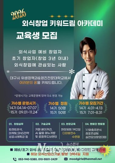 노권율 대구광역시 위생정책과장은 “이번 외식창업 ‘키워드림’ 아카데미가 침체된 지역경제에 새로운 활력을 불어넣길 기대한다”며 “내실 있는 교육과정 운영을 통해 실패를 최소화하는 창업 생태계를 조성하고, 대구 외식업계가 지속 가능한 성장을 이어갈 수 있도록 적극 지원하겠다”고 말했다.