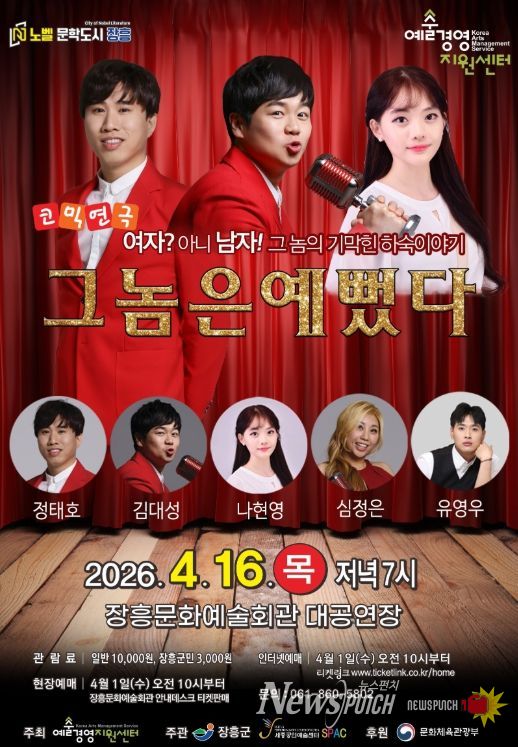 뉴스펀치 김용희 기자 | 장흥문화예술회관은 오는 4월 16일 저녁 7시 대공연장에서 정태호, 김대성 등 KBS 공채 출신 개그맨들이 펼치는 코믹연극 ‘그놈은 예뻤다’ 공연을 개최한다.