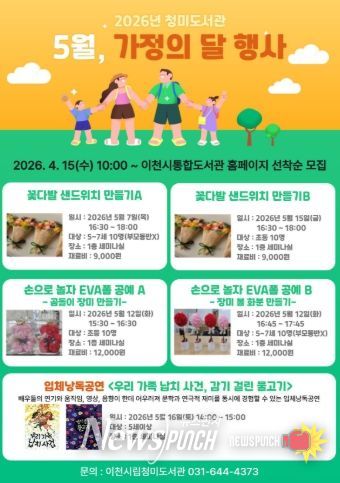 뉴스펀치 박상훈 기자 | 이천시 청미도서관은 5월 가정의 달을 맞아 오는 5월 7일부터 5월 16일까지 어린이들을 위한 체험 프로그램과 가족들을 위한 입체낭독공연을 운영한다.