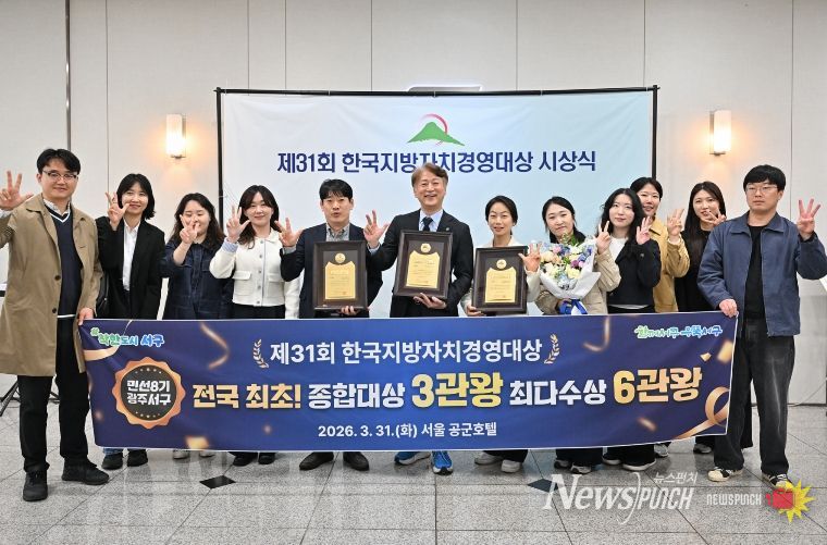 뉴스펀치 김용희 기자 | 광주광역시 서구가 대한민국 지방자치의 흐름을 바꾸는 상징적 기록을 세웠다. 서구는 31일 서울 공군호텔에서 (사)한국공공자치연구원 주관으로 열린 제31회 한국지방자치경영대상 시상식에서 최고 영예인 ‘종합대상’을 수상했다. 이번 수상은 단순한 성과를 넘어 지방정부의 역할과 방향을 새롭게 정의한 ‘기준의 전환’이라는 점에서 의미가 크다.