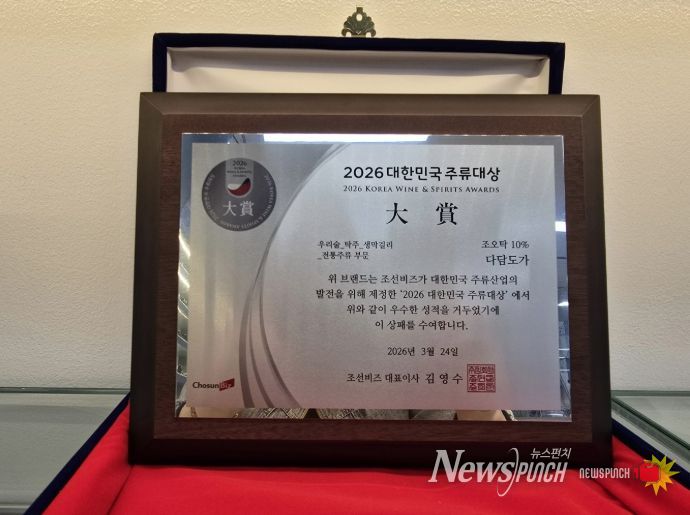 뉴스펀치 박세훈 기자 | 상주시 외남면 소재 다담도가의 조오탁 10%가 지난 3월 24일 조선비즈가 주최하는 ‘2026 대한민국 주류대상’ 우리술 탁주 생막걸리 전통주류 부문에서 ‘대상’을 수상했다.