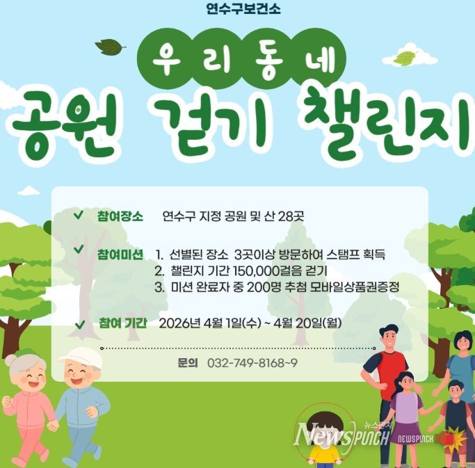 뉴스펀치 정홍균 기자 | 연수구보건소는 구민의 건강 증진과 일상 속 걷기 실천 확산을 위해 ‘2026 우리동네 공원 스탬프투어’를 이달 20일까지 운영한다.