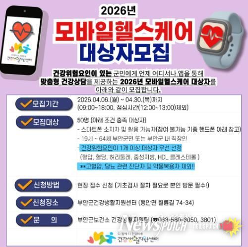 뉴스펀치 최영남 기자 | 부안군보건소는 ICT(정보통신기술)를 기반으로 한 개인 맞춤형 건강관리 서비스인 모바일 헬스케어 사업 참여자를 오는 6일부터 30일까지 선착순 50명 모집한다고 밝혔다.