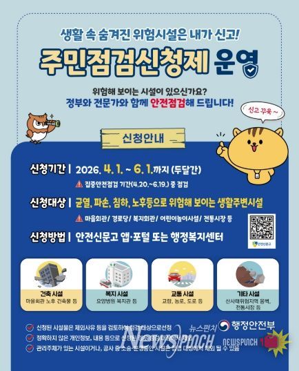특히 군은 주민이 직접 점검이 필요한 시설을 신청하는 ‘주민점검신청제’를 집중 운영한다. 신청 기간은 4월 1일부터 6월 1일까지이며, 마을회관이나 경로당 등 생활 밀착형 시설이 주요 대상이다. 안전신문고 앱 또는 읍·면 행정복지센터 방문을 통해 신청 가능하며, 공사 중이거나 소송·분쟁 중인 시설 등은 제외된다.