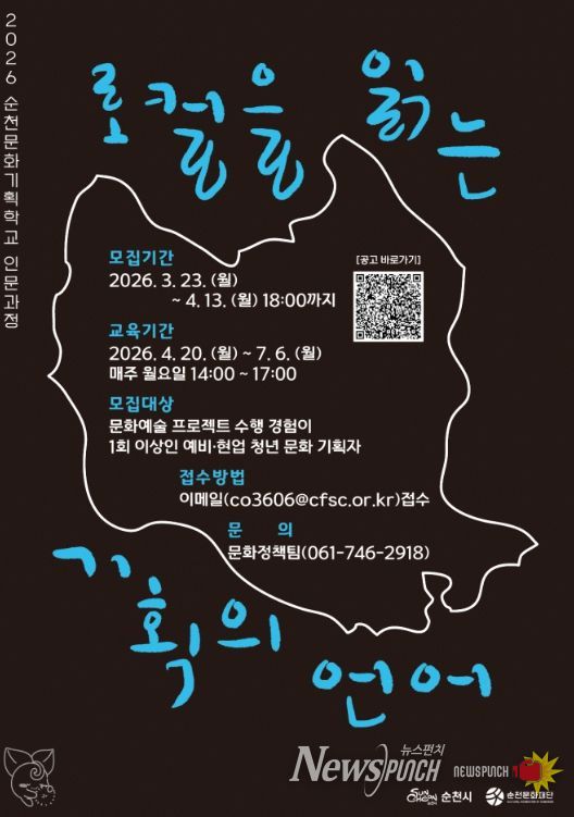 뉴스펀치 김용희 기자 | (재)순천문화재단은 오는 13일까지 ‘2026 순천문화기획학교 인문과정 '로컬을 읽는 기획의 언어'(이하 인문과정)’ 수강생을 공개 모집한다.