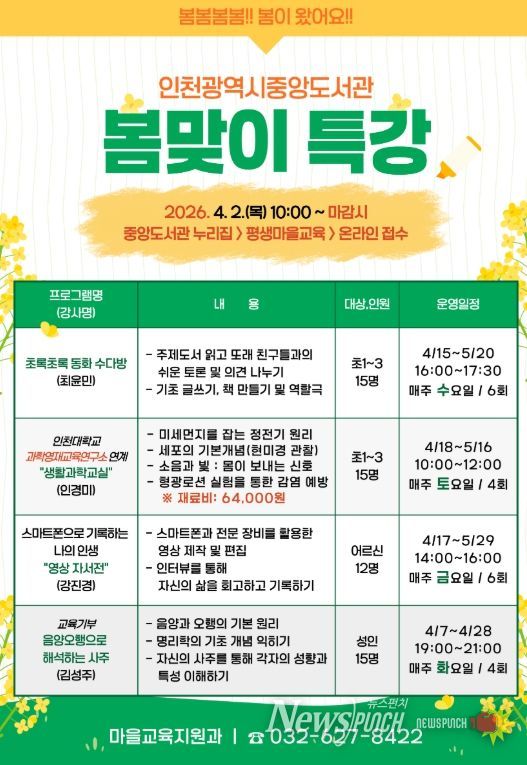 뉴스펀치 정홍균 기자 | 인천광역시교육청중앙도서관은 4월부터 지역주민의 배움과 여가를 지원하기 위하여, 다양한 연령층을 대상으로 ‘봄맞이 특강’을 운영한다.