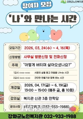 뉴스펀치 정홍균 기자 | 강화군노인복지관이 어르신들의 정서적 안정과 사회적 관계 형성을 지원하는 이야기 나눔 모임 '‘나’와 만나는 시간'의 참여자를 모집한다고 밝혔다.