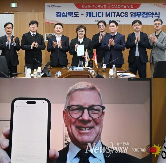 뉴스펀치 박세훈 기자 | 경상북도는 1일 도청에서 양금희 경제부지사와 Mitacs 대표 스티븐 루카스(Stephen Lucas), 대학 관계자 등이 화상으로 참석한 가운데 캐나다 비영리 연구 협력기관인 Mitacs(마이탁스)와 업무협약을 체결하고, 항공 분야 청년 인재 양성 및 산·학·연 연계 산업 협력을 모색하기로 했다.