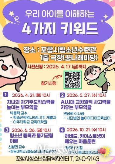 사전 신청은 오는 17일까지 온라인을 통해 접수 가능하며, 청소년 자녀를 둔 부모라면 누구나 참여할 수 있다. 자세한 문의는 포항시청소년상담복지센터로 하면 된다.