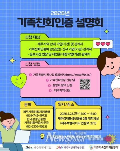 뉴스펀치 김용희 기자 | 제주특별자치도와 제주여성가족연구원 제주가족친화지원센터는 2026년 가족친화인증 신규 및 재인증 신청 접수에 따라 도내 기업(관)을 대상으로 가족친화인증 설명회를 개최한다.