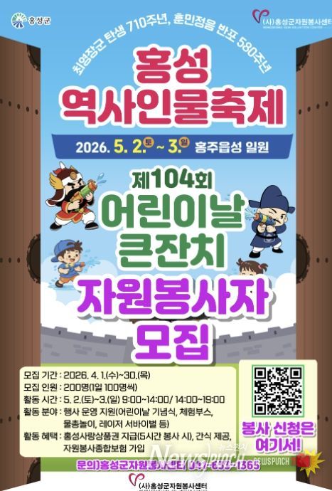 뉴스펀치 이현승 기자 | (사)홍성군자원봉사센터는 오는 5월 2일부터 3일까지, 이틀간 홍주읍성 일원에서 개최되는 ‘2026 홍성군역사인물축제 × 어린이날 큰 잔치’의 성공적인 운영을 위해 자원봉사자 200명을 모집한다고 밝혔다.