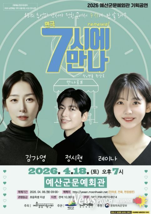 뉴스펀치 이현승 기자 | 예산군문예회관은 (재)예술경영지원센터 ‘2026 공연예술 유통지원 사업’ 공모에 4개 작품이 선정돼 국비 1억4000만 원을 확보하고 첫 공연으로 오는 4월 18일 오후 7시 연극 ‘7시에 만나’를 선보인다고 밝혔다.