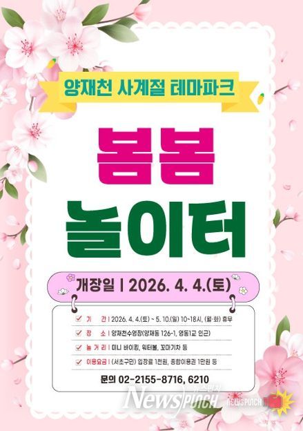 전성수 서초구청장은 “겨울철 눈썰매장으로 운영되던 양재천 공간을 봄철에는 온 가족이 즐길 수 있는 놀이공간으로 조성했다”며 “계절마다 다양한 즐길거리를 제공하는 양재천에 많은 가족들이 방문해 즐거운 시간을 보내길 바란다”고 말했다.