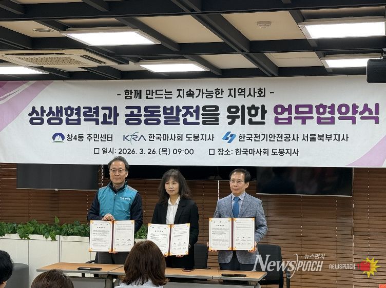 뉴스펀치 박상훈 기자 | 서울 도봉구 창4동은 지난 3월 26일 한국마사회 도봉지사 1층 전자카드센터에서 한국마사회 도봉지사, 한국전기안전공사 서울북부지사와 ‘함께 만드는 지속가능한 지역사회 상생협력과 공동발전’ 업무협약을 체결했다.