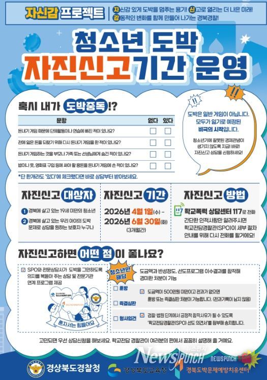 뉴스펀치 박세훈 기자 | 경북교육청은 6월 30일까지 3개월간 경북경찰청, 경북도박문제예방치유센터와 함께 ‘청소년 도박 자진신고 기간’을 운영한다고 2일 밝혔다.