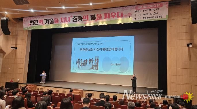 군은 지난 1일 청양군 문예회관 대공연장에서 소속 직원 300여 명이 참석한 가운데 ‘2026년 사회적 장애인식개선 교육’을 실시했다고 밝혔다.