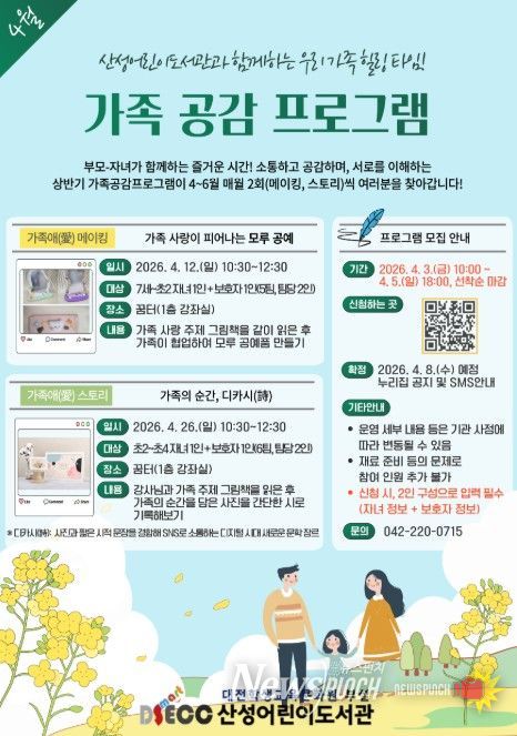 뉴스펀치 이현승 기자 | 대전시교육청 대전학생교육문화원 부설 산성어린이도서관은 부모와 자녀 간 소통 강화를 위한 2026년 상반기 ‘가족 공감 프로그램’을 이달부터 오는 6월까지 운영한다고 밝혔다.