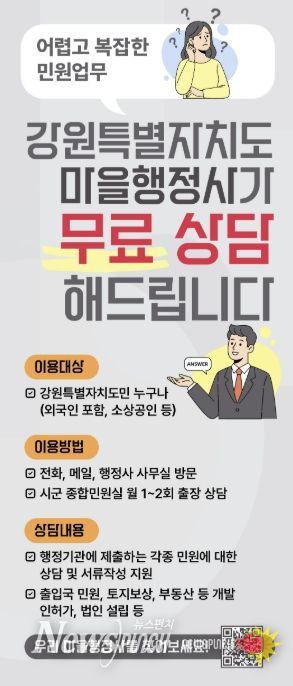 이와 함께 홍천군은 대면 소통을 강화하기 위해 ‘출장 상담소’를 별도로 운영한다. 출장 상담은 매월 둘째 주와 넷째 주 수요일 오후 1시부터 4시까지 홍천군청 민원실에서 열리며, 당일 현장 접수순으로 상담을 진행한다 .출장 상담은 시군 마을 행정사로 위촉된 행정사가 돌아가며 1명씩 상담을 진행할 예정이다.
