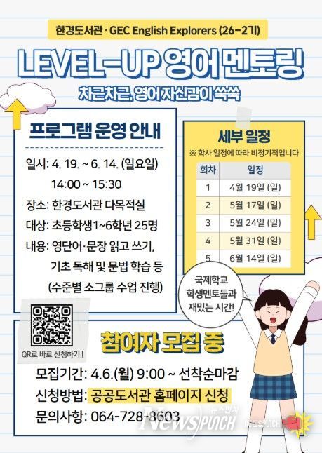 뉴스펀치 김용희 기자 | 제주시 한경도서관은 지역 어린이들의 영어 기초 학습을 지원하기 위해 ‘레벨업 영어 멘토링’을 운영하고 참여자를 모집한다.