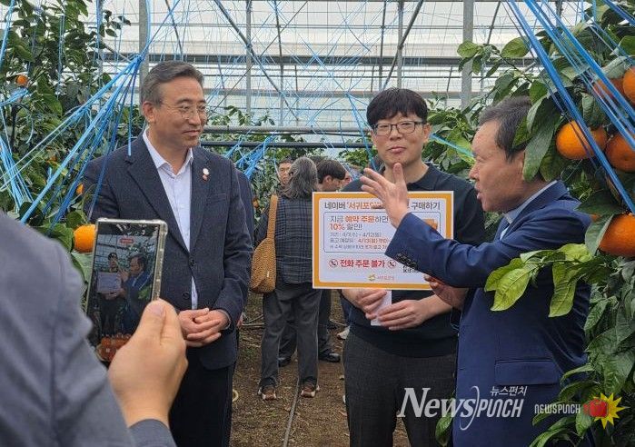 뉴스펀치 김용희 기자 | 서귀포시는 4월 1일, 감귤박물관과 카라향 하우스 일원에서 4월 출하를 앞둔 서귀포산 카라향 홍보를 위해 황창연 신부 영상 촬영에 오순문 서귀포시장이 동반 출연해 카라향 등 만감류 소비 촉진을 호소했다.