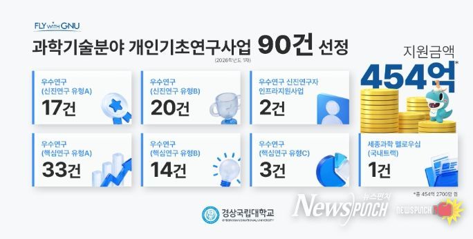이는 지난해 63건, 319억 894만여 원에 비해 건수로는 27건(42.9%), 금액으로는 135억 1860만여 원(42.4%) 증가한 것으로 경상국립대학교의 기초연구의 방향과 우수연구자 양성 전력, 연구역량 등이 전반적으로 인증받은 결과로 풀이된다(2025년 대비 2026년도 사업 유형이 일부 개편됐으나, 유사 유형 기준으로 재분류하여 정리).