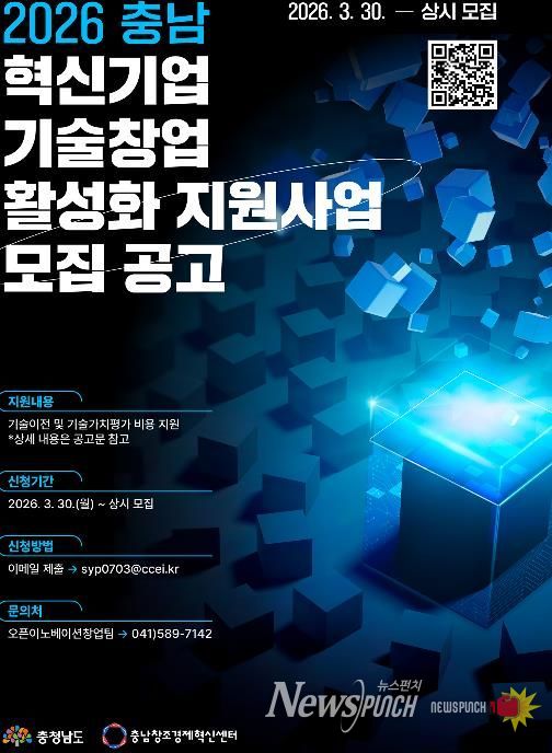 뉴스펀치 이현승 기자 | 충남창조경제혁신센터가 지역 창업기업의 기술 경쟁력을 높이고 성공적인 사업화를 돕기 위해 ‘2026년 충남 혁신기업 기술창업 활성화 지원사업’을 시행하고 참여 기업을 모집한다고 밝혔다.