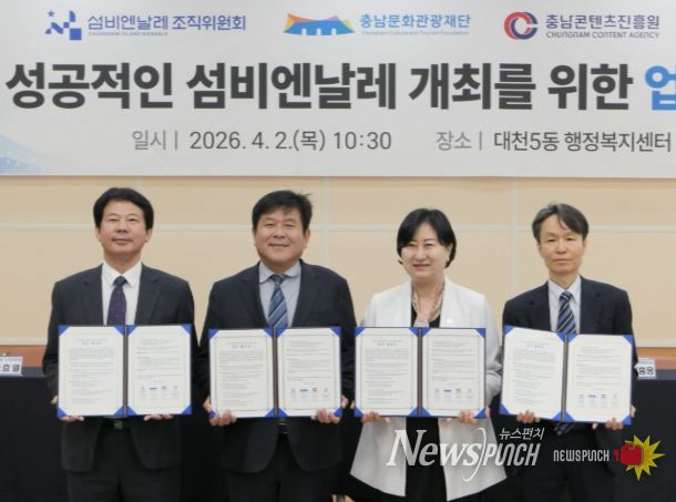 뉴스펀치 이현승 기자 | (재)섬비엔날레조직위원회(사무총장 고효열)는 ‘제1회 섬비엔날레’의 성공적인 개최를 위해 2일 대천5동 회의실에서 충남문화관광재단(대표이사 이기진), 충남콘텐츠진흥원(원장 김곡미), 한국관광공사 대전충남지사(지사장 심홍용)와 4자 업무협약(MOU)을 체결했다고 밝혔다.