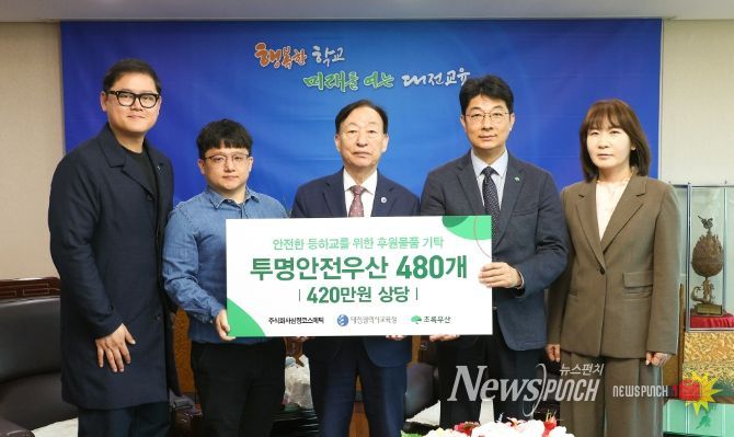 뉴스펀치 이현승 기자 | 대전시교육청은 4월 2일 초록우산 대전세종지역본부로부터 420만 원 상당의 투명안전우산 480개를 전달받는 기탁식을 개최했다고 밝혔다.