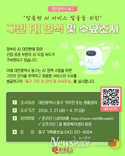 뉴스펀치 이현승 기자 | 대전 동구는 구민이 체감할 수 있는 AI 맞춤형 서비스 발굴을 위해 오는 17일까지 ‘구민 AI 인식 및 수요조사’를 실시한다고 밝혔다.