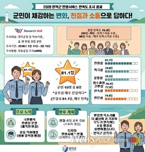 뉴스펀치 박세훈 기자 | 영덕군이 실시한 ‘2026년 민원 서비스 만족도 설문조사’ 결과 종합 만족도 76.8점을 기록하며 군민 중심의 민원 행정이 눈에 띄는 성과를 거두고 있는 것으로 나타났다.
