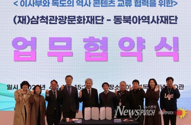 뉴스펀치 조평훈 기자 | (재)삼척관광문화재단은 4월 1일 동북아역사재단과 업무협약(MOU)을 체결하고, 삼척의 대표 역사 인물 이사부와 독도를 중심으로 한 역사 콘텐츠 교류 및 협력 확대를 통한 역사 교육 활성화를 위해 손을 맞잡았다고 밝혔다.