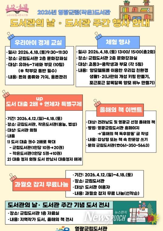 뉴스펀치 김용희 기자 | 영광군은 오는 4월 12일부터‘도서관의 날(4.12.)’과 ‘제62회 도서관 주간’행사를 운영한다고 밝혔다.