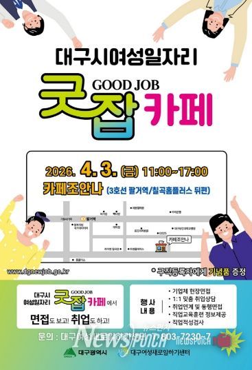 뉴스펀치 조평훈 기자 | 대구광역시는 취업을 희망하는 경력단절 및 미취업 여성을 위해 4월 3일 오전 11시부터 북구 소재 ‘카페 조안나(칠곡점)’에서 올해 첫 ‘찾아가는 여성일자리 굿잡(Good Job)카페’를 개최한다.