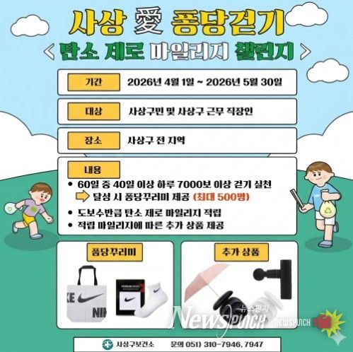뉴스펀치 김윤걸 기자 | 사상구보건소는 일상 속 걷기 실천율을 높이고 건강증진을 위해 4월 1일부터 5월 30일까지 두 달간 ‘2026년 사상퐁당걷기 탄소제로 마일리지 챌린지’를 펼친다.