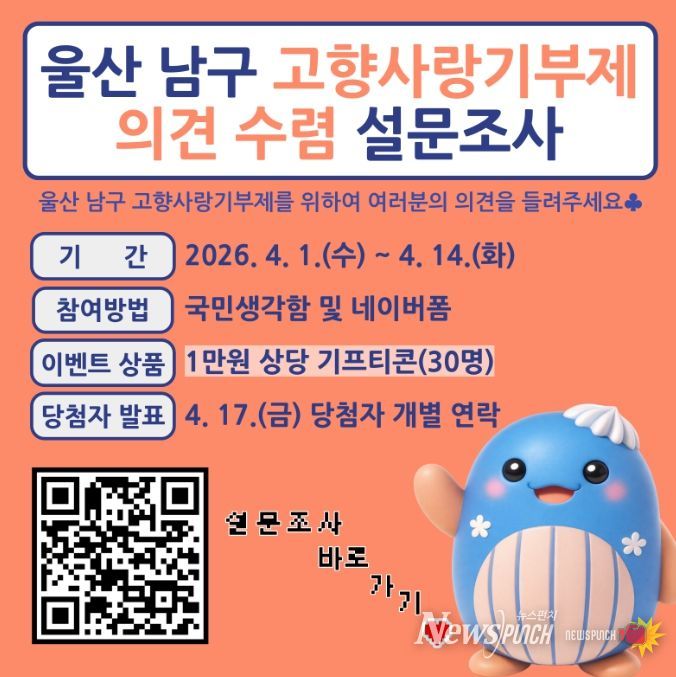 뉴스펀치 김윤걸 기자 | 울산 남구는 기부자의 공감을 이끌어내고 제도의 만족도를 높이기 위해 고향사랑기부제에 관한 설문조사를 실시하고 있다고 2일 밝혔다.