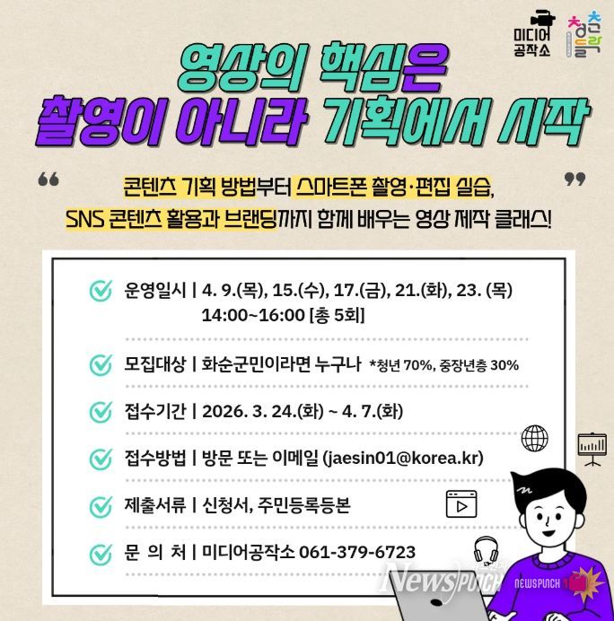 뉴스펀치 김용희 기자 | 화순군은 오는 4월 9일 오후 2시 화순군 청년센터(청춘들락) 미디어공작소에서 군민을 대상으로 영상 제작 교육을 운영하다고 밝혔다.