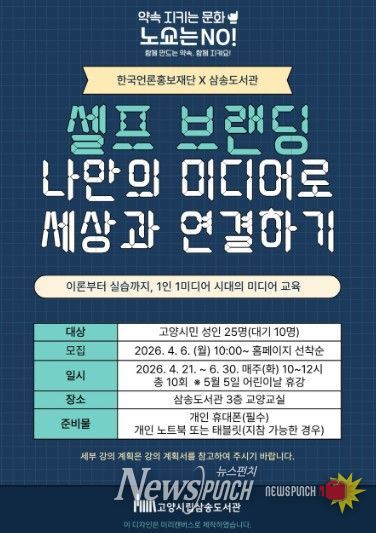 뉴스펀치 박상훈 기자 | 고양특례시 삼송도서관은 오는 4월 21일부터 6월 30일까지 성인 대상의 미디어 교육 ‘셀프 브랜딩: 나만의 미디어로 세상과 연결하기’를 운영한다.