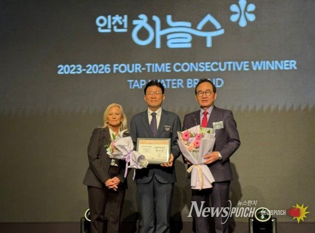 뉴스펀치 정홍균 기자 | 인천광역시 상수도사업본부는 수돗물 브랜드 ‘인천하늘수’가 ‘2026 뉴욕페스티벌 대한민국-국가브랜드대상(The 2026 NYF K-NBA)’ 수돗물 부문에서 4년 연속 대상을 받았다고 밝혔다.