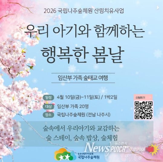 뉴스펀치 김용희 기자 | 산림청 한국산림복지진흥원(원장 직무대행 황성태) 국립나주숲체원은 따뜻한 봄날을 맞아 임산부 가족을 대상으로 숲태교 여행 ‘우리 아기와 함께하는 행복한 봄날’을 운영한다고 밝혔다.