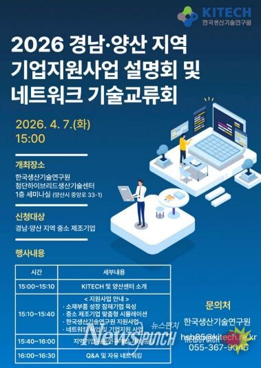뉴스펀치 박세훈 기자 | 양산시는 오는 7일 한국생산기술연구원 첨단하이브리드생산기술센터 세미나실에서 지역 산업 발전 촉진과 관내 제조기업의 기술 혁신을 도모하기 위해 ‘2026년 기업지원사업 설명회 및 네트워크 기술교류회’를 개최한다고 밝혔다.