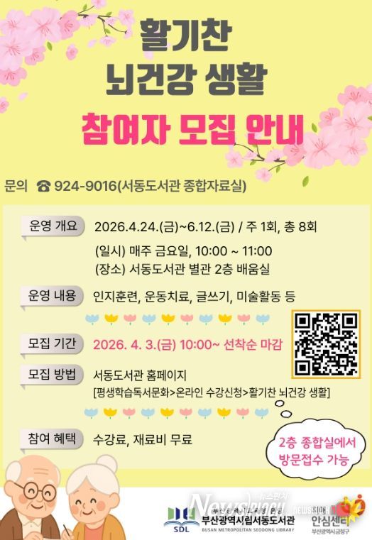뉴스펀치 김윤걸 기자 | 부산광역시교육청서동도서관은 오는 24일부터 6월 12일까지 매주 금요일마다 도서관 별관에서 60세 이상 어르신 12명을 대상으로 ‘활기찬 뇌건강 생활’ 프로그램을 운영한다.