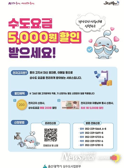 뉴스펀치 김윤걸 기자 | 울산시 상수도사업본부는 시민들의 요금 납부 편의 증진과 종이고지서 사용 감축을 통한 친환경 행정 실현을 위해 오는 5월부터 상수도요금 전자고지 및 자동납부 신청자에게 요금 할인 혜택을 제공한다고 밝혔다.