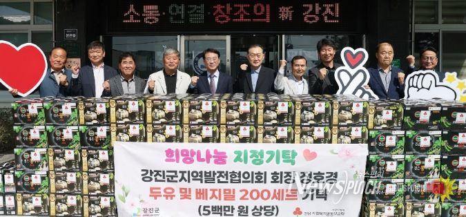 뉴스펀치 김용희 기자 | 강진군지역발전협의회 정호경 회장이 지난 2일 강진군청을 방문해 관내 취약계층을 위한 두유 및 베지밀 200세트(500만 원 상당)를 지정기탁하며 지역사회에 훈훈한 감동을 전하고 있다.