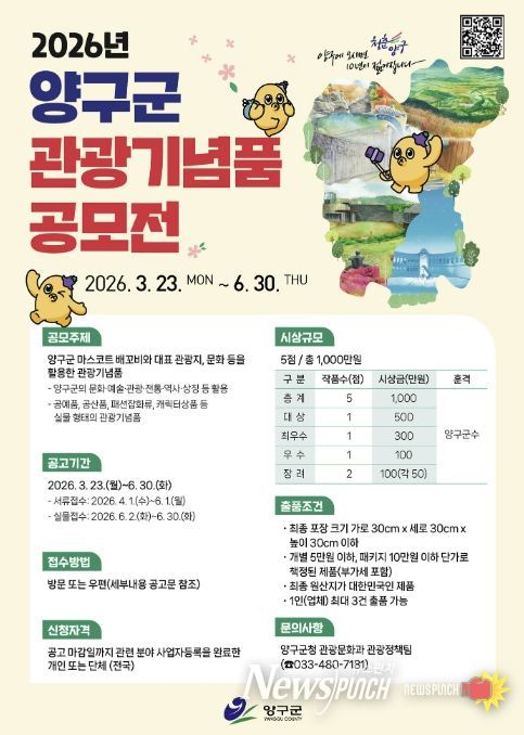 뉴스펀치 조평훈 기자 | 양구군은 지역을 대표할 수 있는 특색 있는 관광기념품을 발굴·육성하기 위해 ‘2026년 양구군 관광기념품 공모전’을 개최한다.