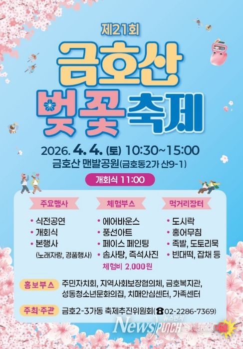 뉴스펀치 박상훈 기자 | 서울 성동구 금호2-3가동은 오는 4월 4일 금호산 맨발공원에서 ‘금호산 벚꽃축제’를 개최한다고 밝혔다.