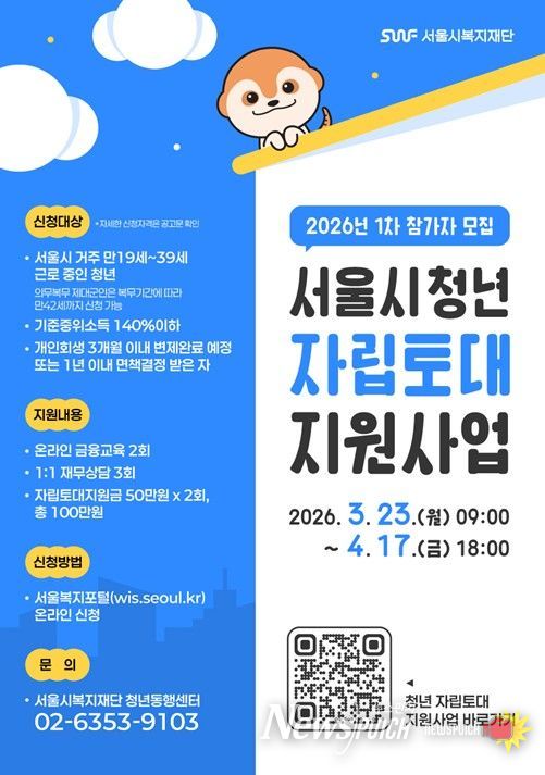 뉴스펀치 박상훈 기자 | 서울시복지재단 금융복지센터는 3월 23일부터 4월 17일까지 ‘서울시 청년자립토대지원사업’ 1차 참가자를 모집한다고 밝혔다.