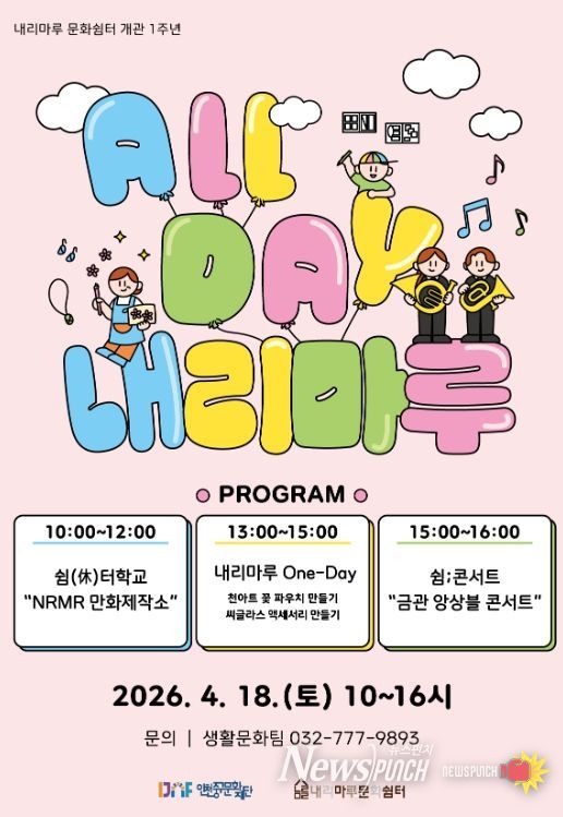 뉴스펀치 정홍균 기자 | (재)인천중구문화재단은 ‘내리마루 문화쉼터’ 개관 1주년을 맞아 오는 4월 18일 ‘올데이(All Day), 내리마루’라는 주제로 공연, 문화예술 교육 등 다양한 주민 참여형 프로그램을 운영한다고 밝혔다.