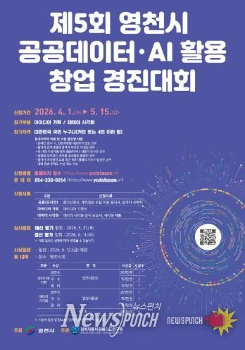 뉴스펀치 박세훈 기자 | 영천시는 공공데이터와 AI 기술과 융합한 창의적인 아이디어를 발굴하기 위해, 4월 1일부터 5월 15일까지 ‘2026년 제5회 공공데이터·AI 활용 창업 경진대회’ 신청을 접수한다고 밝혔다.