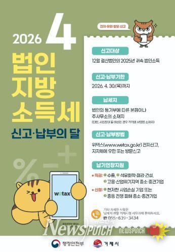 뉴스펀치 박세훈 기자 | 거제시는 2025년 12월 결산 법인을 대상으로 오는 4월 1일부터 30일까지 한 달간 ‘2026년 법인지방소득세 집중 신고·납부 기간’을 운영한다고 밝혔다.