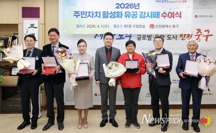 뉴스펀치 정홍균 기자 | 인천시 중구는 ‘통합 1기 주민자치회’ 초기부터 현재까지 중구 주민자치 활성화에 헌신해 온 중구 주민자치협의회 소속 임원과 각 동 주민자치회장 등 총 8명을 대상으로 ‘감사패’를 수여했다고 3일 밝혔다.